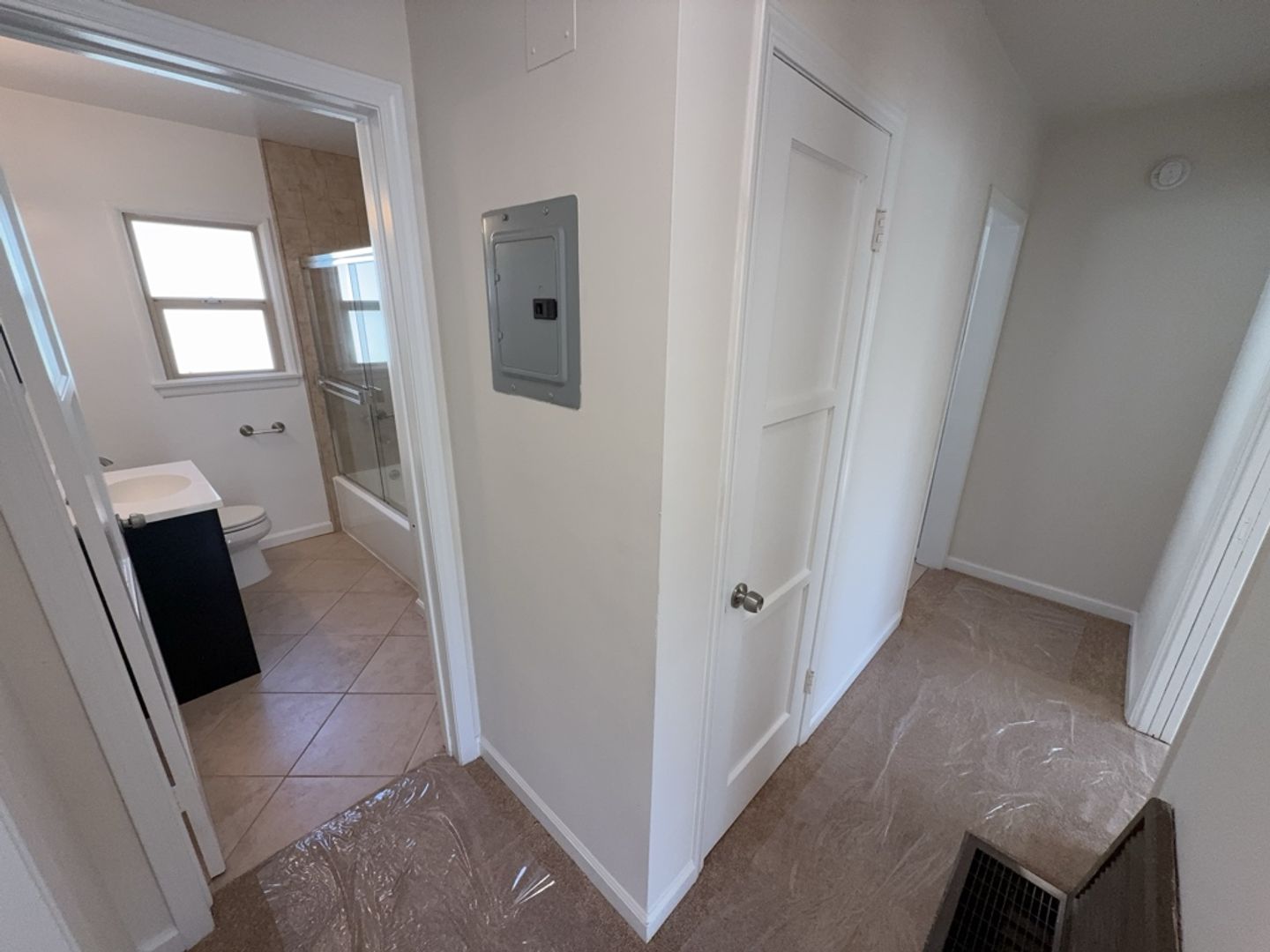 Bathroom has a tiled shower enclosure with glass shower doors. Additional features include front and rear entrances, newer windows with window coverings throughout, and a laundry room with hookups!
